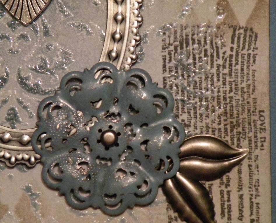 I stamped the chandelier in Pumice Stone and gave it some sparkle with Rock Candy distress ink. I also stamped LOVE and the definition of love in Wendy's Watering Can Archival Ink and Postcard in Wendy's Sky Blue Archival Ink. My favorite part of the card is the embossed heart flower using Wendy's Sky Blue Archival Ink and Embossing Powder...what a cool technique. I finished the card with an Industrious Frame and a silver heart suspended on a chain.